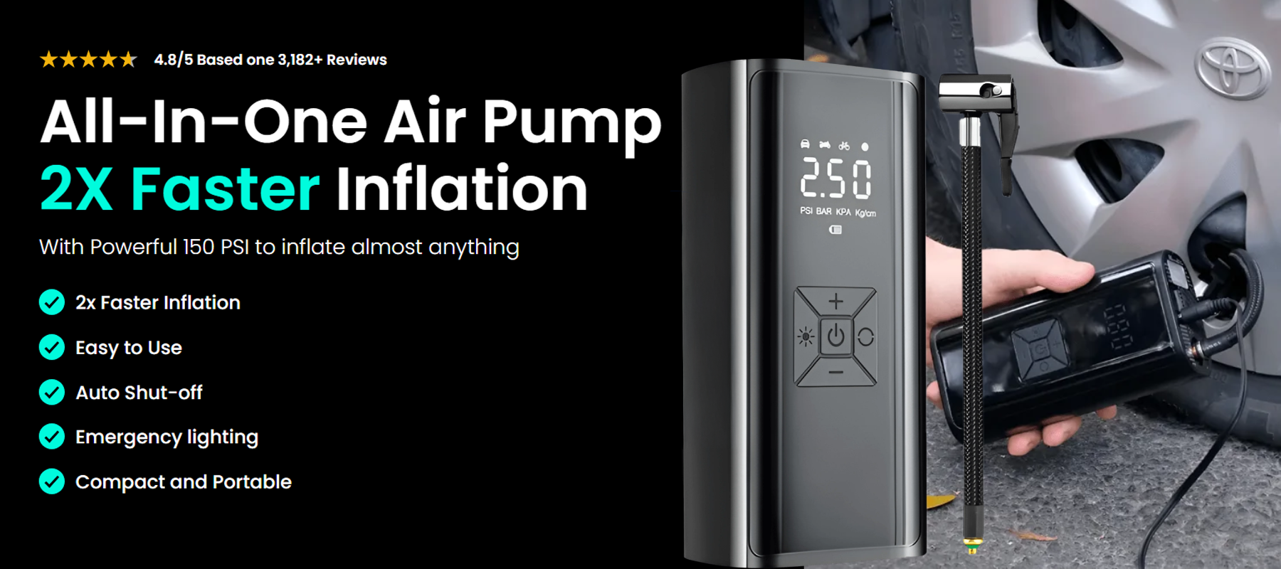 Fastdealmall delivers powerful inflation pressure at 150 PSI with one-touch presets and interchangeable adapter tips. The ultimate on-the-go tool for road trips, biking, camping, and more! Keep moving with Fastdealmall, your essential companion.