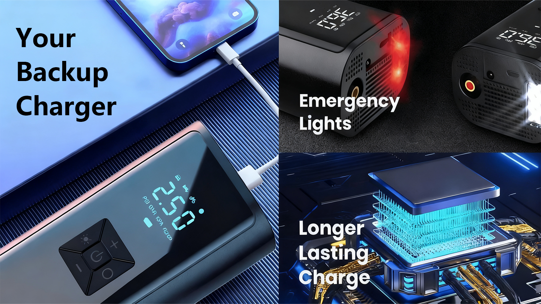 Built in advanced safety Features: Backup Power, LED flashlight, and road side emergency light