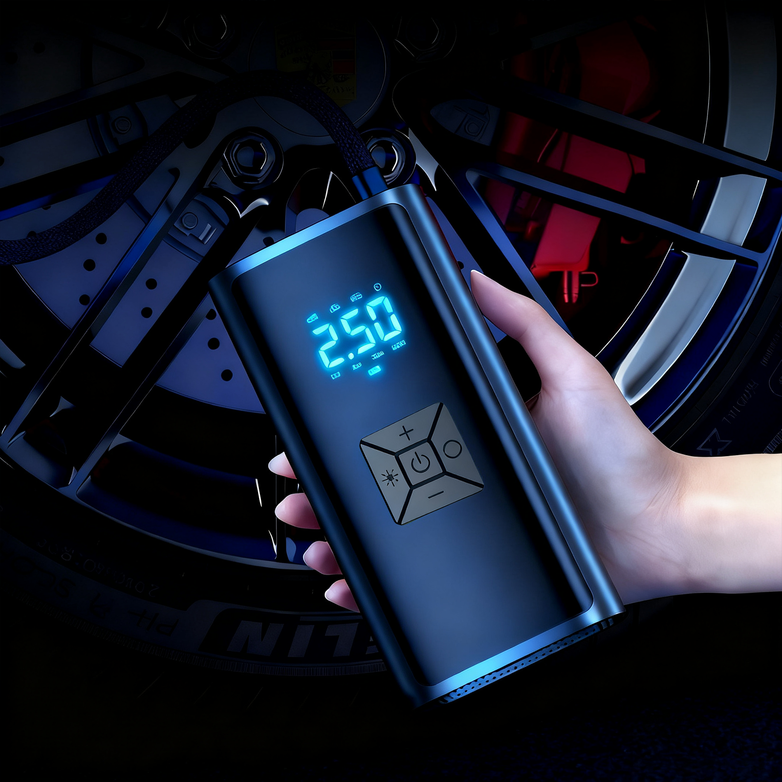 Equipped with a built-in 25000mAh rechargeable battery, this portable air compressor doesn't need to rely on an external power source during operation.