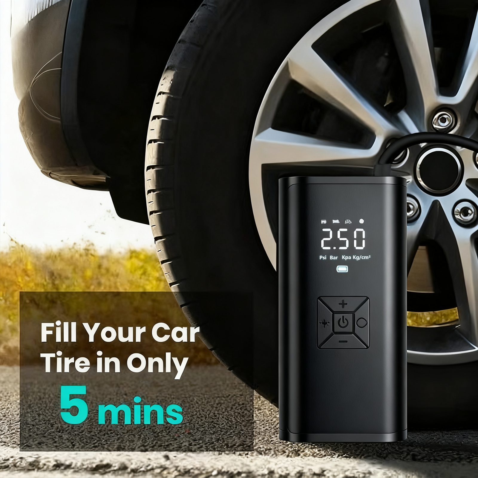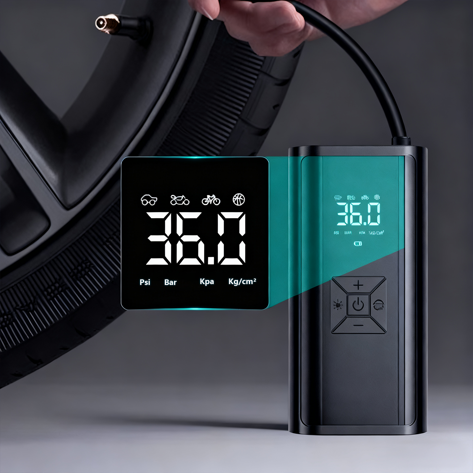 Featuring Larger dual digital LCD screens, the tire pump displays real-time tire pressure and preset data. Easily preset and monitor tire pressure, and enjoy automatic shut-offonce the set pressure is reached, eliminating concerns about over-inflating your tires.
